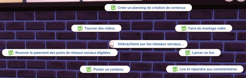 Attention, ceux-ci ne sont pas corrélés à ceux présents dans le mod Road to Fame ni le Simstagram officiel du jeu.