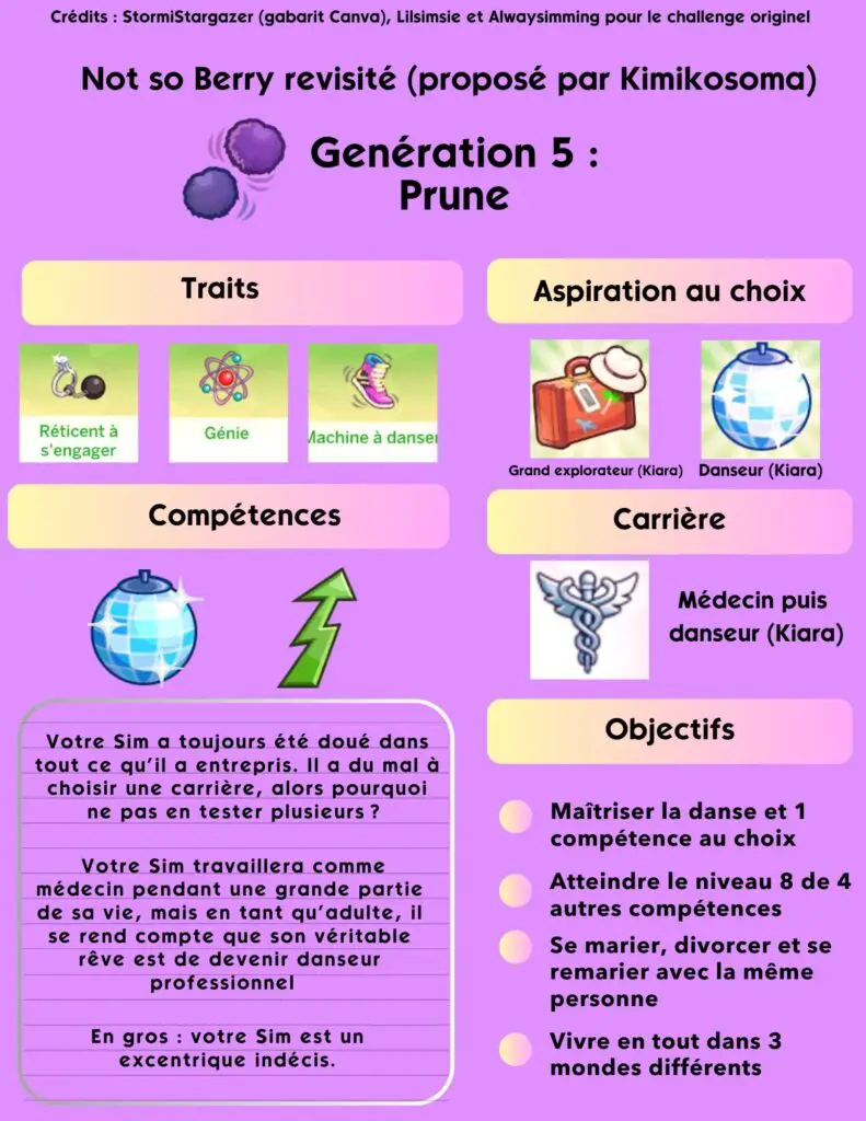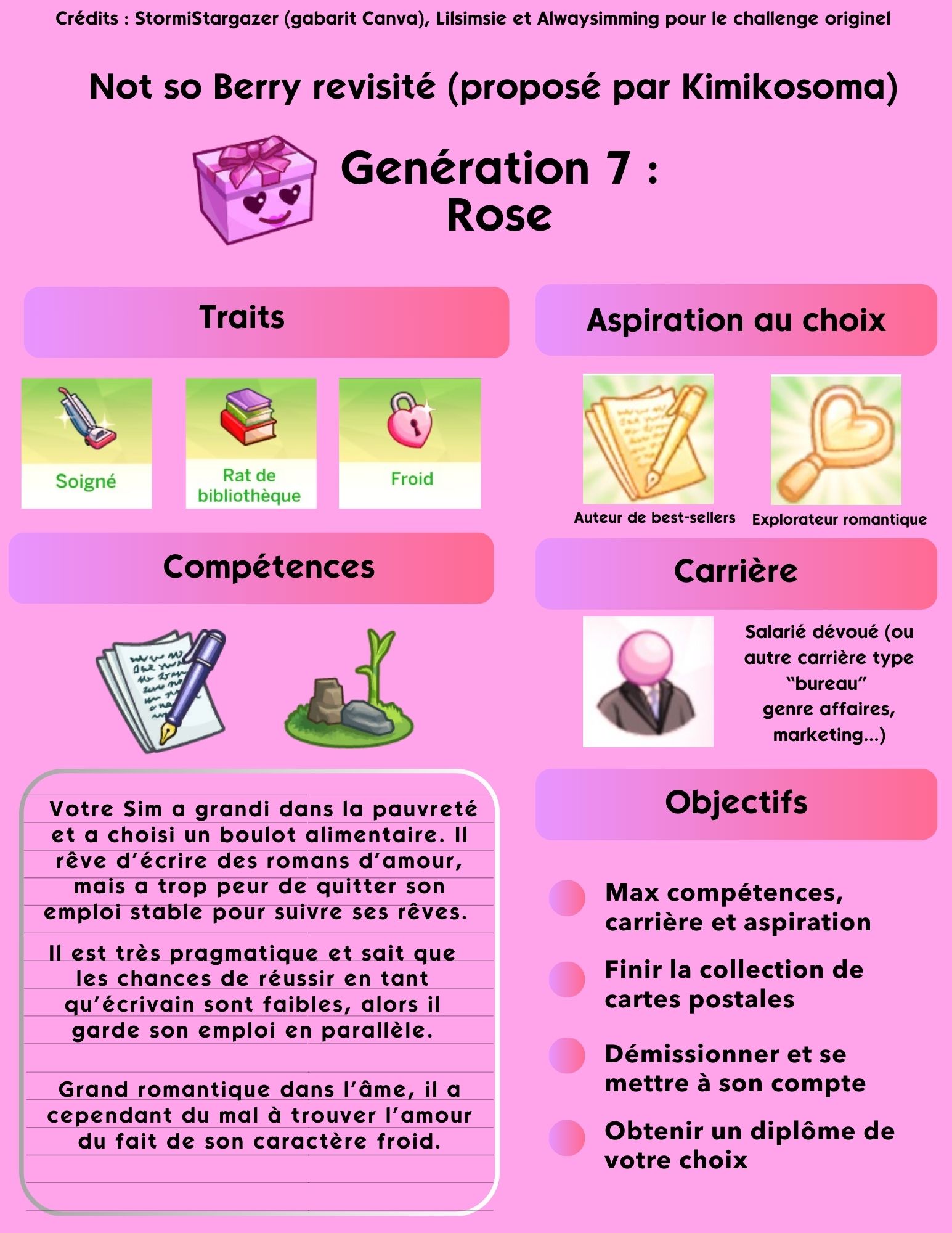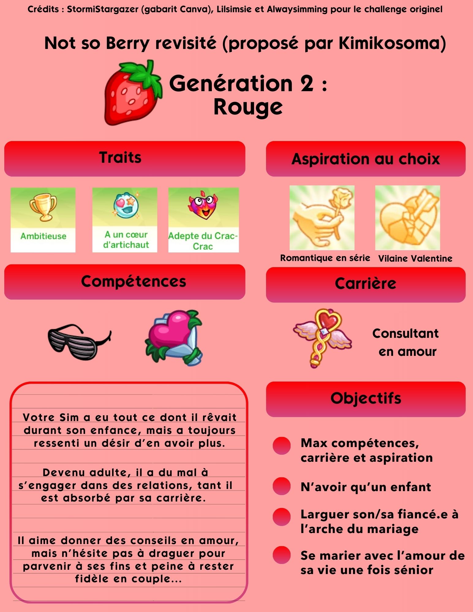 Vous pourrez retrouver ici les règles du challenge initial (en anglais) : https://lilsimsie.tumblr.com/post/157671494755/not-so-berry-legacy-challenge