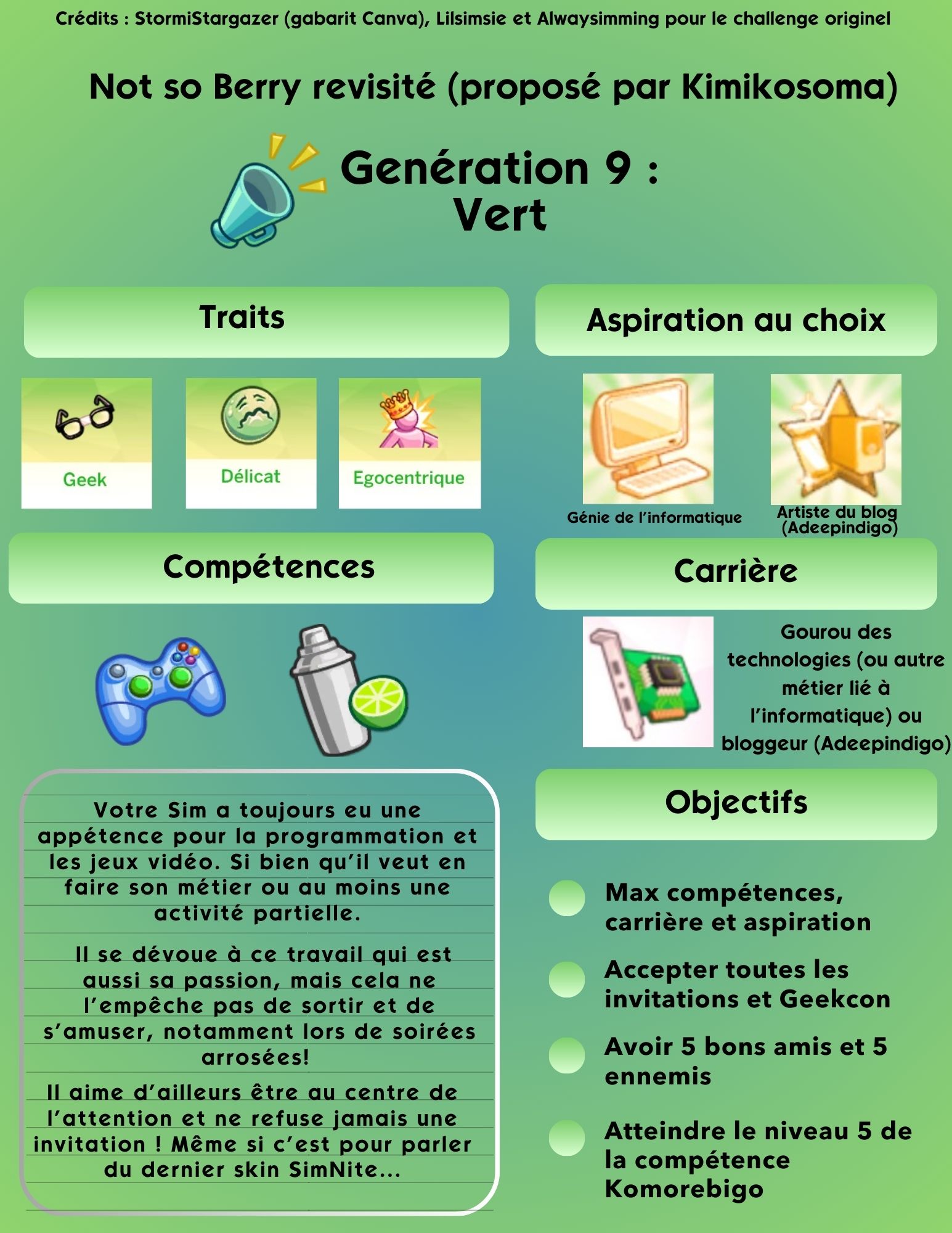 J’en ai modifié/ajouté quelques-unes dans le cadre de ma proposition de ce « nouveau » Not So Berry challenge. Voici les règles du challenge officiel, tel qu’il est connu par la communauté Sims 4 :